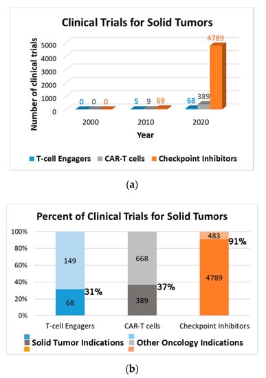 Clinical trials for solid tumors: (a) Comparison of number of clinical trials with TcEs, CAR-Ts and CPIs for solid tumors over time (2000, 2010, 2020). The numbers are from a search in the Citeline database by: (1) Mechanism of action: “CD3 agonism” for TcEs and “immune Checkpoint Inhibitors” for CPIs; (2) Therapeutic area: in both cases, “Oncology”, and as sub-categories all listed solid tumor indications; (3) Therapeutic modality: monoclonal antibodies and all similar classes (chimeric, humanized, human); (4) Timeframe: before year 2000, between years 2000 and 2010, and in year 2020; (b) Percent of clinical trials for solid tumor indications vs. all oncology indications for each of the three therapeutic modalities. The numbers inside the columns correspond to the number of clinical trials. The percent number on the side of each column indicates the percent of clinical trials for solid tumor indications vs. for all oncology indications with each of these therapeutic modalities.