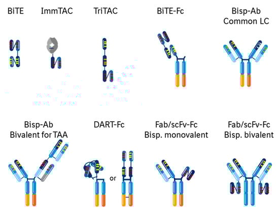 One of the drawbacks to the pioneering BiTE technology was the need for continuous intravenous infusion. BiTEs proved that TcEs can be developed and commercialized. The challenge was to improve on the drug-like properties, and this has been done by addressing several aspects of the technology. Early engineering approaches to improve the biophysical stability of Fvs established the use of linkers or interchain disulfide bonds [61,62], and enabled BiTE structures. Meanwhile, Knob-in-hole mutations in the CH3 domain of the Fc were ingeniously designed to form Fc heterodimers [63], and introduced Fc-containing, more antibody-like bispecifics. Subsequent to BiTEs, further protein engineering has led to various multispecific structures such as CrossMabs with CH1-CL crossover [64], TandAbs (Tandem diabodies) [65], DARTs (dual-affinity re-targeting) [66], ITEs (IgG-like T-cell Engaging bispecific antibody) [31], BEATs (Bispecific Engagement by Antibodies based on the T cell receptor), ImmTACs (Immune mobilising monoclonal TCRs against cancer) [34], TriTACs (Tri-specific T-cell Activating Construct) [67], and numerous other small domain or full antibody-like constructs [68,69]. Several such multispecific structures are currently used in TcE modality (Figure 2, Table 1). This variety of formats permits the identification of the most potent, safe and manufacturable ones for a given therapeutic concept [25,65,70,71,72,73]: monovalent vs. bivalent binding for one or both targets, different affinity and epitope binders, different size, distance and geometry of the binding domains and the whole molecule.