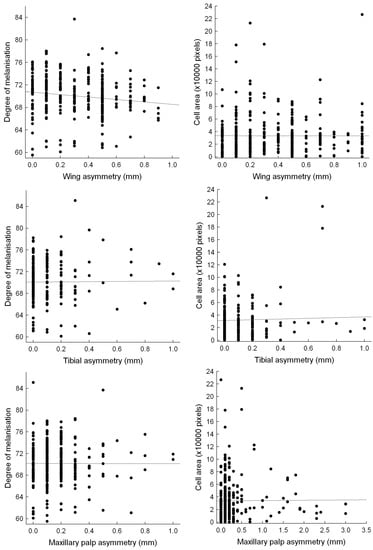 Individuals with higher immune responses, as measured by cell melanisation at the implant site, were more likely to have symmetrical wings (or lower wing FA). There was no significant relationship between immune response and tibia or maxillary palp symmetry (Table 1; Fig. 1); however, there was a trend (P < 0.1) for maxillary palps to be more symmetrical in individuals with lower rates of cell deposition at the implant site (Table 1).