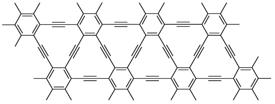 Another direction in which theoretical and experimental study of carbon-rich systems has recently proceeded is toward the conceptual expansion of graphite by insertion of sp-hybridized acetylene units between adjacent phenyl rings, giving the structure known as graphyne, shown in Figure 1 [12,13]. Though the synthesis of graphyne has remained elusive, successively larger fragments have been modeled and synthesized in attempts to predict properties of the bulk material, and these fragments have interesting properties in their own right. In a recent theoretical work on graphyne molecules and oligomers [14], the relationships between aromaticity, HOMO-LUMO-gaps and the molecular connectivities are discussed, using a set of different conjugation pathways.