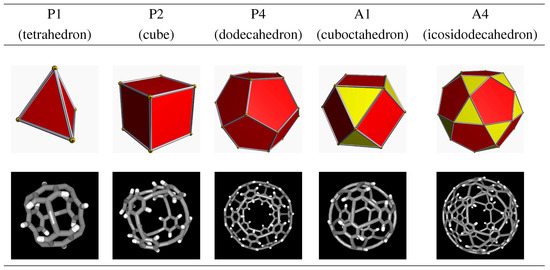 For the studies undertaken here, we chose the three valid transformations of the Platonic solids (P1, P2, and P4) as well as the two most symmetrical of the Archimedean solids (A1 and A4), shown in Figure 2.