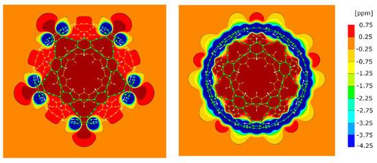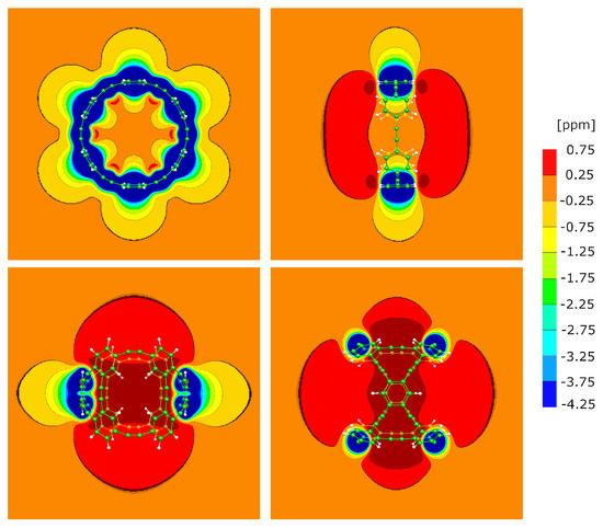 The electronic configuration of our molecules and the graphyne sheet were characterized by means of Nucleus Independent Chemical Shift (NICS) maps, which is a measure of the electronic linear response to an external magnetic field B [19,20,21,22,23,24]. NICS maps are a generalization of nuclear magnetic shielding tensors as known from NMR spectroscopy, where they quantify the screening of the nuclear spins from the external magnetic field due to ring currents of the electronic orbitals [25,26,27,28,29]. This screening effect is not only defined for the actual nuclear spins, but in all points of space. A large spatial extent of the shielding field indicates a strong aromatic response of the electrons, while a local increase of the external field is a common consequence of an antiaromatic character of the electrons. The electronically induced field is proportional to the externally applied one, so that in practice, the proportionality coefficient is calculated; this factor is dimensionless, because it is the ratio between two magnetic fields. Since its magnitude is typically of the order of 10, it is normally given in ppm (parts per million, 10).