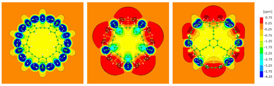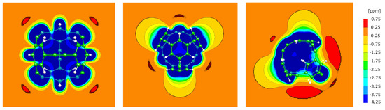 There is a close connection between spatial shielding/deshielding and the characteristics of the electronic configuration [21,39,40,41,42]. Aromatic electron systems induce a large shielded area around themselves, while deshielded regions are a typical signature of an anti-aromatic electronic subsystem [22,23,43,44,45]. Note, however, that in regions of sizeable electronic density, the shielding always dominates; the different signatures are only visible distances of about an Angstroms or more from the covalent bonds.