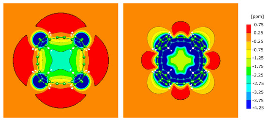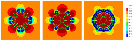 The P4 molecule has an almost spherical shape and a magnetic response signature similar to the one of P2. Three NICS slices are presented in Figure 8, illustrating that the amplitude and size of the paratropic regions outside the molecule are larger than in the case of P1 and P2, while inside the cage, there is still a sizeable diatropic shielding of about one ppm.