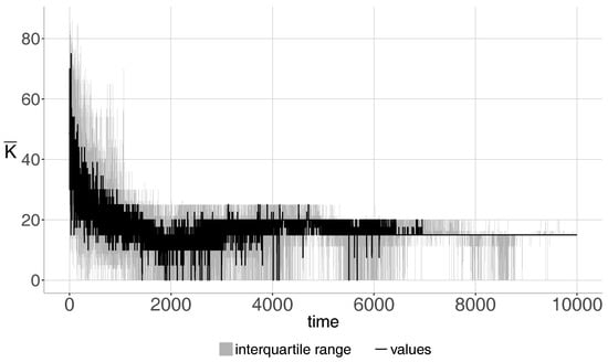 The exploratory simulation is run ten times with the same parameter settings. One year consists of 360 days and one day consists of 24 h. One hour represents the minimum connection length. The parameters that characterize the end users’ decision process are set to make the end users quality and price sensitive. This reflect the real behavior of the consumers, as in most cases they balance between offered quality and price. The behavior of such defined agents was thoroughly investigated in []. Finally, the learning parameter which controls the linear reward-inaction pricing algorithm is set in such a way that the systems gradually converges to the global equilibrium point as suggested in []. The other parameter settings are based on the previous sensitivity analysis and experimental testing. Complete simulation settings are shown in Table 3. The values of the output variables were averaged over the 1000 days.