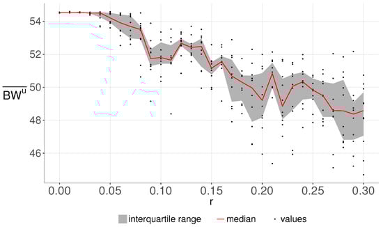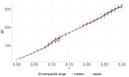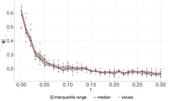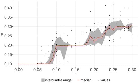 A relationship between the risk-free rate of return r and the average propensity to invest revealed in the simulation is depicted in Figure 4. It is evident that, as the risk-free rate of return r increases, the average propensity to invest decreases; i.e., the SOs invest less in the secondary spectrum markets. This finding is a consequence of the risk-averse preferences of SOs that are typical of the traditional theory of investments. In contrast, that SOs make risk-free investments even if is not as surprising and is present today in monetary markets even when the discount rates of the national central banks are negative. In our case, we explain this phenomenon using our small-scale retail spectrum market where SOs—if investing all financial sources into forwards—are not able to utilize them in the retail market because of insufficient demand. In this situation, SOs cannot sell the RBs at their disposal and incur financial losses.