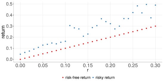 The main investment motive is to earn profits. In our model, two possibilities exist for the SO to gain profits. The SO receives a certain yield in the form of risk-free returns. A relationship exists between the risk-free rate of return r and the overall average daily return of the SO, as shown in Figure 8. If the risk-free rate of return equals 0, the SO’s overall daily profit is negligible because the SO can earn a profit only by investing in the frequency spectrum. Therefore, SOs that invest more than half of their budget in the frequency spectrum oversupply the retail market. This oversupply leads to low retail prices and low SO income. If the risk-free return is high, the SO invests almost all of its money risk-free; thus, its yield almost equals the invested amount. The linear relationship between the risk-free rate of return and the SO’s average daily return is given by the considerable financial resources invested risk-free. This relationship is also obvious from Figure 9, where the blue points represent the returns achieved on the secondary spectrum markets and the red points denote the risk-free returns. The long-term returns from the frequency spectrum are higher than those from the risk-free return, which is also one of the well-known laws in the theory of investments. The difference between the two returns is an extraordinary reward for the investor facing risks and is called the risk premium. The risk premium should be positive and long term, as proven in our simulation case. In contrast, the increase in the risk-free return also induces the increase in risky investments, as depicted in Figure 9.