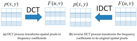 The discrete cosine transform (DCT) is a kind of transformation technique that separates the image into several spectral sub-bands of different importance [9]. The process of DCT is to transform an image from spatial pixels to frequency coefficients. The DCT is a reversible process. After the inverse DCT process, the frequency coefficients can be transformed to their original spatial pixels. A diagram of the DCT processes is shown in Figure 1.