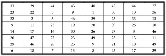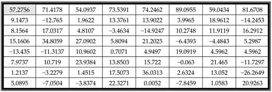 In the equation, is a pixel value in the coordinate of the block, and is the corresponding coefficient in the coordinate of the block. and are the width and height of the block, respectively. The top-left corner coefficient is the most important coefficient, called the DC coefficient or the constant components. The other coefficients are the alternating-current quantized coefficients called AC. For example, Figure 2 is a block with a size and Figure 3 is the coefficient table of Figure 2. The DC value of the figure is 57.2756, which defines the basic hue for the entire block.