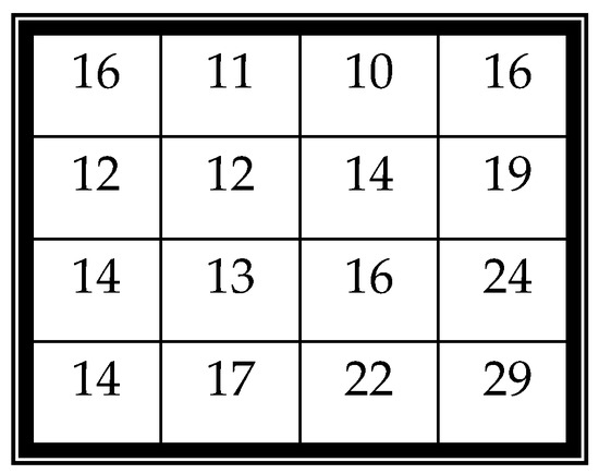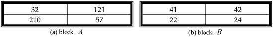 In 2012, Lu proposed a diagonal watermarking scheme to detect image manipulation [10]. In the scheme, an image is separated into four parts, and each part is divided into several blocks. Every block has a corresponding block in another part. Two blocks form a block pair. The average values of the two blocks are the authentication code. For example, Figure 4a,b are two example blocks. The average values of block and are