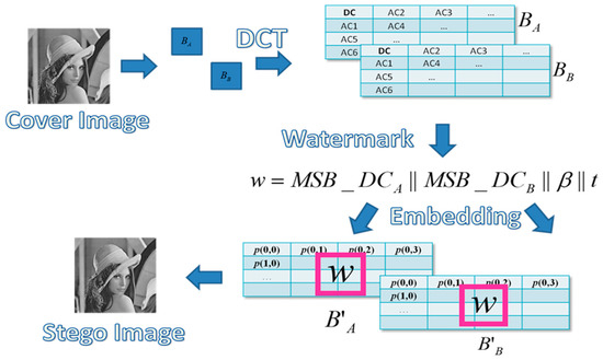 The diagram of the embedding process of the proposed scheme is shown in Figure 5. A cover image is divided into several blocks performed by DCT transformation. A watermark is constructed to be embedded in the block pair to generate the stego-image.