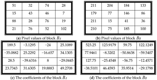 For example, Figure 8a,b are two example blocks. The corresponding coefficients of the blocks are shown in Figure 8c,d.