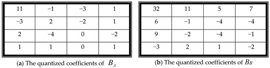 For example, a quantization table with QF = 50 is shown in Figure 9. The coefficients in Figure 6c,d after quantization using Figure 7 are shown in Figure 8a,b.
