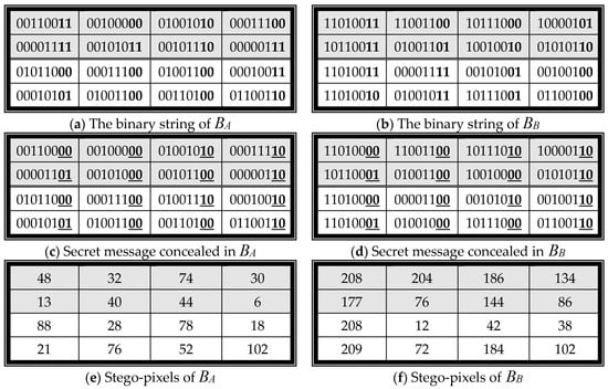 For example, Figure 11a shows the binary string of each pixel of BA. The block BA is divided into two sub-blocks. The first sub-block is colored gray. The second sub-block is colored white. The watermark w = 0000101001000010 is then concealed in each binary string using LSB. Each pixel conceals two secret message bits to generate the stego-binary string. The watermark is concealed in both sub-blocks. Each sub-block owns one watermark. The results are shown in Figure 11c. Finally, the proposed scheme transforms the binary string into a decimal number to get the stego-pixels, such as in Figure 11e. The watermark is also concealed in BB to get the stego-block B’B, such as in Figure 11f.