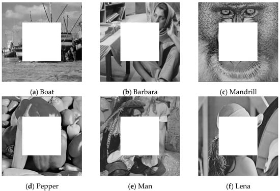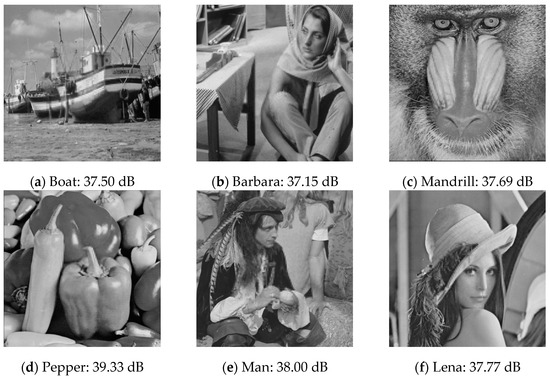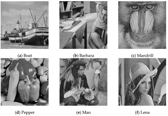 In this section, we shall demonstrate the effectiveness of the proposed scheme with several experimental results. Six 512 512-sized grayscale images were used to test the performance of the proposed scheme. The images were “Boat”, “Barbara”, “Mandrill”, “Pepper”, “Man”, and “Lena”, shown in Figure 12a–f, respectively. The scheme was implemented by MATLAB R2014b in Windows 10 64-bit operating system, Intel® Core(TM) i7-6700 CPU @ 3.40 GHz 3.40 GHz, 16GB RAM.