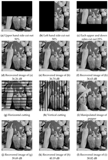 With the second experiment, we blacked out 50% of each test image at various locations. Six different types of tampering distributions are shown in Figure 16a–c,g–i. The recovered images are shown in Figure 16d–f,j–l, respectively. The image quality is higher than 36.2 dB.