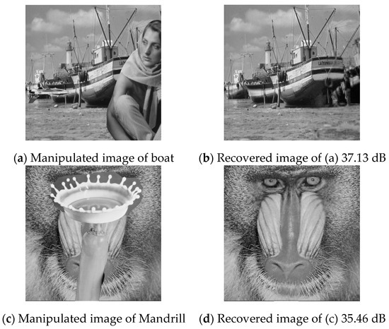 In the third experiment, two kinds of malicious manipulations were applied to the test images Boat and Mandrill. The manipulated images are shown in Figure 17a,c and their recovered images are shown in Figure 17b,d, respectively. The PSNR values of the recovered images are higher than 35 dB.