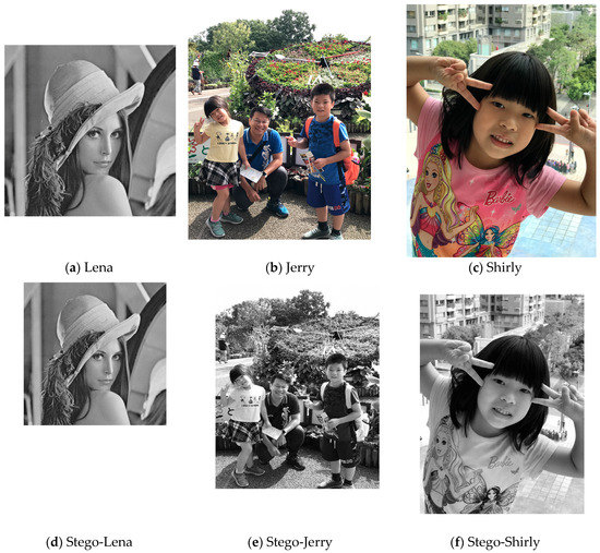 The proposed scheme was not only developed in a personal computer (PC) environment but also implemented in the mobile device iPad Pro 256GB with iOS11 system. The system was developed by Mathworks. Three test images with large sizes were used to test the performance of the proposed scheme: Lena (1252 1252), Jerry (2016 1512), and Shirly (4032 3024). Figure 18 shows the test images with large sizes. The experimental results of these test images are shown in Table 3. For the test image Lena, sized 12521252, the execution time of the PC is about 10 s and that of the iPad is about 11 s. For the test image Jerry, sized 2016 1512, the execution time of the PC is 19 s and that of the iPad is 27 s. For the largest test image, Shirly, sized 4032 3024, the execution time of the PC is 78 s and that of the iPad is 91 s. The PSNR values are the same in different devices. From the results, we can see that the proposed scheme can perform very well on the mobile device.