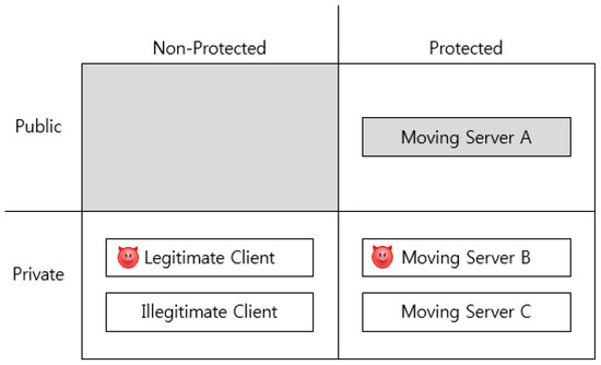 The moving server A in the protected/public area is directly accessible from the outside. MTD technology to protect these types of servers is not mentioned in this paper because it has been studied extensively. The legitimate client in the non-protected/private area uses the MTD approach so as to access the moving servers in the protected/private area. The illegitimate client does not participate in MTD. Both of these clients can be infected by an attacker through a drive-by-download attack. When the illegitimate client is infected by an attacker, an attacker can detect the moving servers through internal network scanning. This case is not covered in this paper because it is identical to the case of an external attacker scanning to detect moving server A.