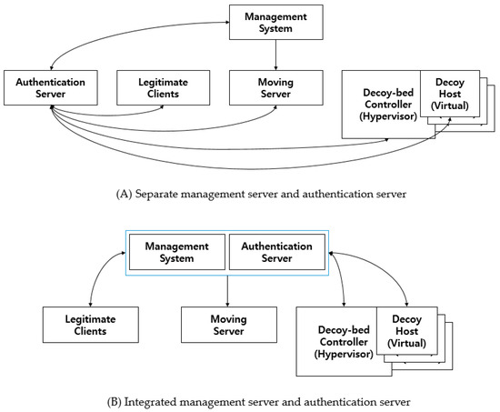 The management system is functionally separated from the authentication server, as shown in Figure 2A, but it can operate with the authentication server in a physical machine, as shown in Figure 2B.
