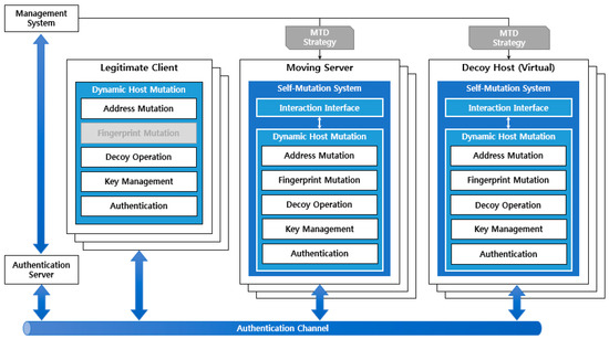 The authentication and key management are responsible for authentication and key distribution for all entities [24,25]. The moving server and decoy host have interfaces for interactions by which to receive the mutation strategy from the management system. The decoy host needs the address mutation because it has to undergo mutation, like the moving server. The legitimate client does not mutate, but it needs to know the changed address of the moving server. Hence, it only knows the address generation rule through the address mutation.