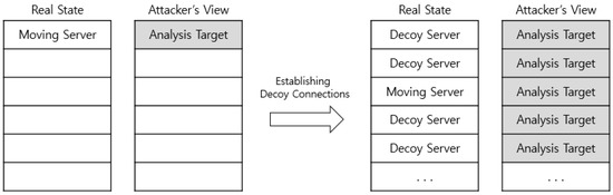 The first step in the connection obfuscation is, as shown in Figure 4, deliberately to increase the number of legitimate client connections that the insider must analyze to detect the target. Henceforth in this paper, these connections are called decoy connections. Decoy connections are between the legitimate client and the decoy server. In previous studies that did not consider insider threats, the decoy server was used only to expand the attack surface, whereas in this study, which considers insider threats, decoy servers should establish decoy connections with the legitimate clients.