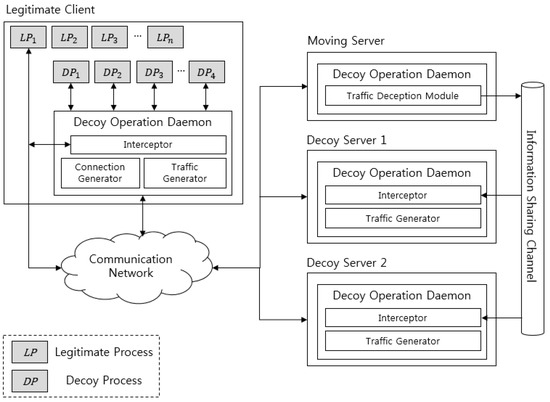 The traffic generator module of the decoy server mimics the outbound traffic of the moving server and generates traffic between the decoy server and the DP. The traffic deception module of the moving server shares the characteristics of the outbound traffic generated by the moving server to decoy servers through a secure channel. The traffic generator module of the decoy server, like the traffic generator module of the legitimate client, analyzes the pattern of traffic generated by the moving server and determines a policy within a range that is judged to be similar.