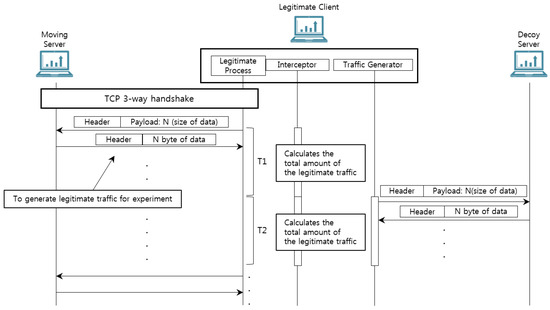 In order to generate the legitimate traffic for the experiment, the legitimate client sends an integer value N to the moving server every 3 s, and the moving server that receives this packet creates an N-byte-sized packet (payload size only) and sends it to the legitimate client. The integer value increases by 1 every 3 s within the range of 20–100, and decreases by 1 when it reaches the maximum value. In this experiment, the traffic generated as above is regarded as the legitimate traffic. The interceptor module monitors the ports that are communicating with the moving server through tcpdump and calculates the total amount of legitimate traffic. For intuitive consistency comparisons, traffic computed via tcpdump only considers traffic generated by experimental applications.