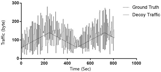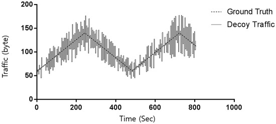 The ground truth is the phase of the legitimate traffic with a certain pattern over time. In the experiment in Figure 9, the traffic generator randomly generates the decoy traffic within the next time period by the amount of legitimate traffic generated in the previous time period. As you can see, although the decoy traffic seems to be very consistent with the ground truth, it is not identical. In order to increase the consistency between the decoy traffic and the ground truth, we applied the decoy traffic randomly but reduced the displacement. Figure 10 shows the decoy traffic with reduced displacement. In order to reduce the displacement of decoy traffic, we adjusted the range of randomly generated decoy traffic to approach the average value.