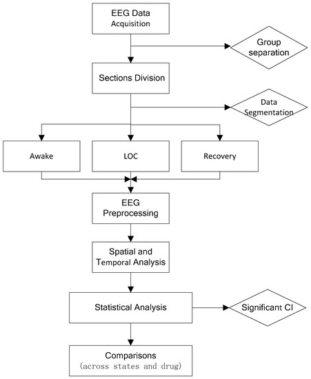 - Purdon, P.L.; Pierce, E.T.; Mukamel, E.A.; Prerau, M.J.; Walsh, J.L.; Wong, K.F.K.; Salazar-Gomez, A.F.; Harrell, P.G.; Sampson, A.L.; Cimenser, A. Electroencephalogram signatures of loss and recovery of consciousness from propofol. Proc. Natl. Acad. Sci. USA 2013, 110, E1142–E1151. [Google Scholar] [CrossRef] [PubMed]