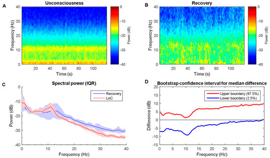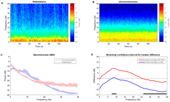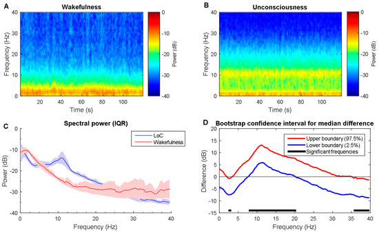 Time-frequency dynamics between wakefulness and unconsciousness for desflurane. (A,B) wakefulness and unconsciousness spectrograms; (C) Group-averaged power spectra (solid line, median; shaded area, 25th–75th percentile IQR); and, (D) The upper (red) and lower (blue) represent the bootstrapped 95% confidence interval bounds for the difference between spectra shown in panel C. Solid horizonal black line indicates significant frequency range. LoC: loss of consciousness.