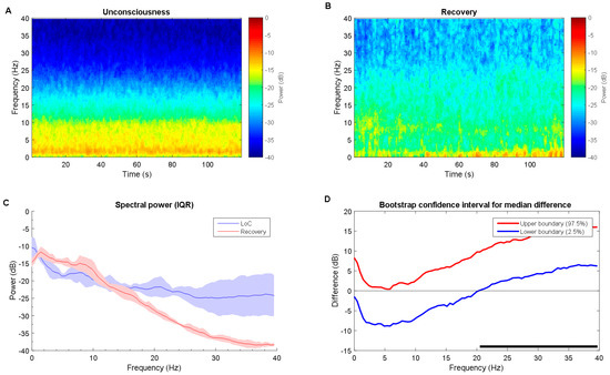 Time-frequency dynamics between unconsciousness and recovery for desflurane group. (A,B) LoC and recovery spectrograms; (C) Group-averaged power spectra (solid line, median; shaded area, 25th–75th percentile IQR). They show similar EEG power distribution during the LoC state and recovery; and, (D) The upper (red) and lower (blue) represent the bootstrapped 95% confidence interval bounds for the difference between spectra shown in panel C. The high beta and gamma ranges show LoC state power is significantly higher than recovery state. The recovery state looks very similar to awake state in Figure 4. Solid horizonal black line indicates significant frequency range. LoC: loss of consciousness.