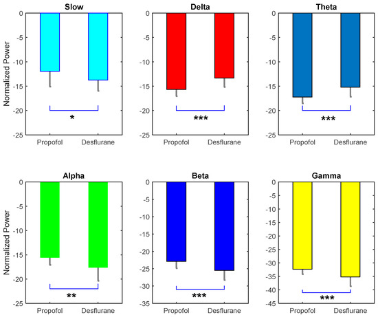 Absolute mean power comparison between six frequency bands. It is evident that each pair is significant. Except delta and theta, all power in propofol group is higher than desflurane. Power shown in dB after z-score * p < 0.05; ** p < 0.01; *** p < 0.005.
