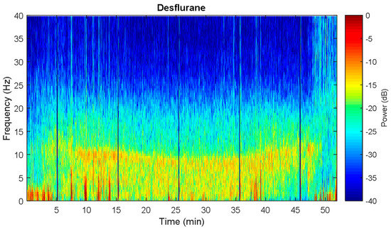 Spectral dynamics from Oone representative of desflurane patient. The anesthetized state is characterized by slow to alpha wave dominance, especially for alpha significant increase. Vertical sharp line denotes some noise perturbation.