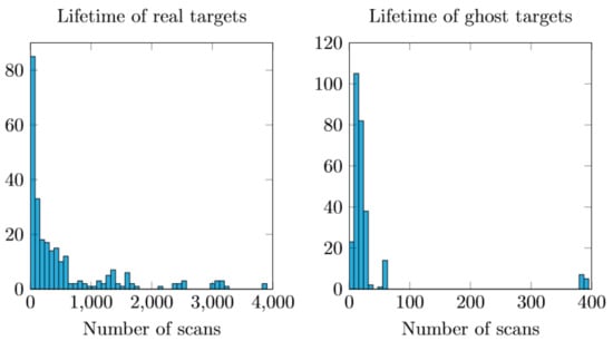 Track lifetime indicates how many scans were processed since the measurement associated with the track first appeared. Figure 2 shows the generation-time distribution for general objects and ghost targets. Generation time of a general object is distributed between 0 and 4000 scans, while generation time of a ghost target is mainly distributed within 100 scans. This reflects ghost targets that disappear soon after they are created.