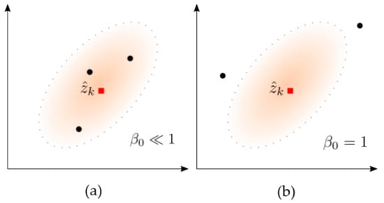 Ghost targets are less likely to exhibit similar conditions across multiple scans; that is, inter-scan coherency is small. Therefore, if a ghost target is included in the validation gate of a tracker, then the same ghost target is less likely to be included in the validation gate in the next scan. In other words, if only one ghost target is included in the validation gate of the tracker, then there is a high probability that no measurements will be included in the next scan. The index that numerically reflects this is β0. As shown in Figure 3, if several measurements enter the validation gate in the correction step, the calculated β0 is small and close to zero. On the other hand, if no measurements are included in the validation gate, then the calculated β0 will be 1.