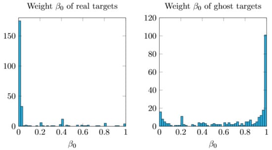Figure 4 shows that the β0 distribution of the actual object and the ghost target have different tendencies. Most real objects have a weight close to 0, whereas most of the weight values of ghost targets are close to 1.