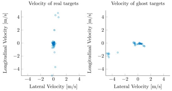 Figure 5 shows that actual objects and ghost targets have different distributions (even at the tracker’s estimated position), and Figure 6 shows the difference between the position in the previous scan and the current scan. A radar installed in a fixed position captures the movement of vehicles approaching in the longitudinal direction. Therefore, the real target generally tends to move in the longitudinal direction, and the ghost targets show no special behavior or lateral movement compared to real targets.