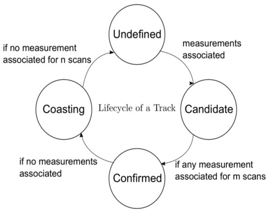 This study used a PDAF for multiple-target tracking. The devised multiple-target tracker, which is based on the PDAF, labels each track with four states: undefined, candidate, confirmed, and coasting as shown in Figure 7 []. Undefined is assigned to targets that had never been processed before. If a track keeps a candidate state for a predefined number of ticks, then it becomes confirmed. The confirmed state is assigned to the tracks that need to be displayed. A confirmed track transforms into a coasting track if no measurement is associated for a predefined number of ticks. The devised multiple-target tracker consists of five procedures. These procedures execute sequentially but can be pipelined if needed.