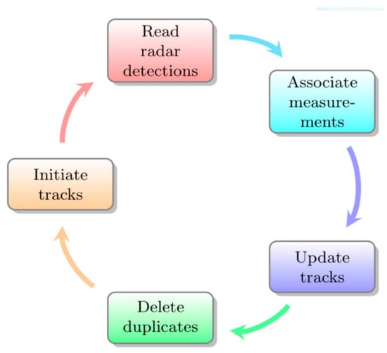 For each tick, a set of measurements is read by the radar sensor as shown in Figure 8 (Read radar detections, Figure 8). If a measurement is close enough to a track, it is used to update the state of the track. If not, the measurement itself becomes a track. Tracks that have no associated measurement for a predefined number of ticks are deleted by the tracker (Associate measurements and Update tracks, Figure 8).