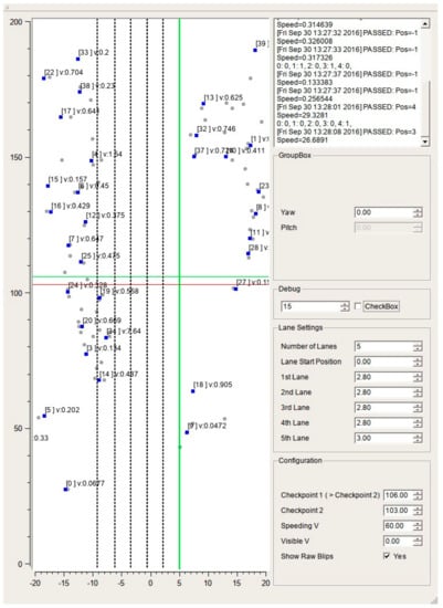 Figure 9 shows the user interface of this study’s implementation for easy tracking of multiple objects in real time. The user interface uses Qt, which is widely used as a cross-platform application framework. The status of the tracker is represented by a blue square point, along with the top tracker identification number, speed, and the position of each measurement, indicated by a gray rounded dot. The lanes are represented by dotted lines in the longitudinal direction, and the number of lanes and the width of each of the lanes can be instantly modified through a menu on the user interface. In order to cope with cases where the installation angle of the radar does not match the direction of the road, a function to rotate the radar measurements with respect to the origin is implemented.
