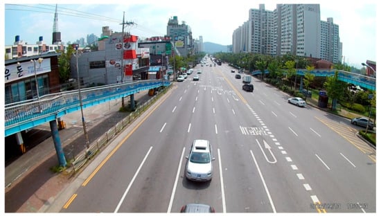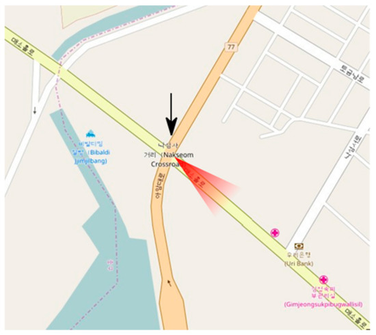 The measurements were carried out at the overpass of the Nakseom intersection in Yonghyun 5 Dong, Nam-gu, Incheon, located within 1 km of the Nakseom intersection with a starting point at the Kyungin Expressway and an ending point at the origin of the 2nd Kyungin Expressway. The radar traffic measurement system was installed at a pedestrian crossing across the southwest road of the Nakseom intersection, and was installed along the road to the southwest. The arrow in Figure 10 shows the location of the Nakseom intersection, and the translucent red triangle shows the field of view of the radar traffic measurement system (see Figure 11). The vehicles measured are those coming in the direction opposite to the radar direction.