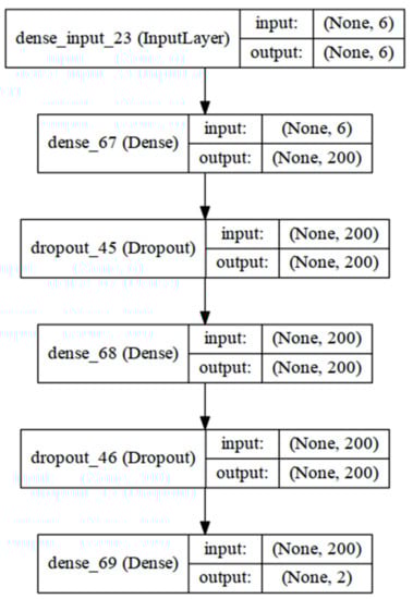 Figure 12 represents the structure of a multilayer perceptron for separating ghost targets from real targets. The input layer (dense input 23) has six elements, which are tracker generation time, weight β0, longitudinal displacement and velocity, and lateral displacement and velocity. The input data pass through a fully connected layer using a rectified linear unit (ReLU) as its active function. At this point, some of the nodes in the layer are dropped. Dropout is one of the normalization methods that perform learning by randomly selecting and removing some nodes in one layer of the artificial neural network, and it is possible to achieve high accuracy by preventing models from overfitting [,]. The hidden layer data pass to the output layer where some ReLU nodes are dropped through a connection using softmax as an active function to form two output nodes (dense 69): (a) a ghost target; and (b) not a ghost target.