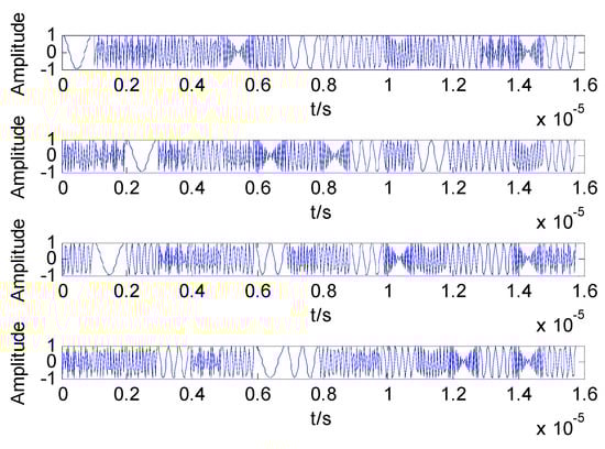 Suppose that the MIMO radar transmits four channel DFCW signals, i.e., . The pulse width is set to and the sub pulse width has a relation denoted as . The fundamental frequency is , let the bandwidth be and the sampling rate . Besides, is set to the default value of . After a series of experiments, the PSO algorithm has a population size of 20, and the number of cluster centers is equal to 4. The cognitive and social factors are set as 2 and the inertia weight is 0.3. Moreover, the maximum number of iterations is set to 20, the velocity upper limit is equal to 1.5, and the fitness function threshold . The value of the radiation factor in the data field is 0.1. The weighted index m in FCM algorithm is equal to 2, and the iteration stop threshold . The time domain waveform of the four transmission signals are shown in Figure 1.
