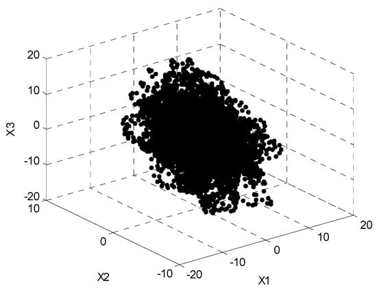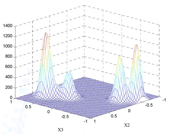 The observed signal is processed by a single-source principal value of complex angular detection. After that, the direction of the observed signal is obviously improved, but there are still many noisy and isolated points. As shown in Figure 3a, the measured data is regarded as particles in the data field and projected onto the unit hemisphere with a positive axis of . The potential value of the particles are calculated according to Equation (15). Using Cartesian grids, each dimension of data space is divided into 50 equal parts. The potential values at each grid point are obtained to establish the potential field. The projection of the potential field on three planes is given by Figure 3b–d, respectively. Figure 4 shows the three-dimensional potentiometric map on the X2–3 plane. In the diagram, the concentration of equipotential line and magnitude of the potential at a point are proportional to the density of the data points. By obtaining the extrema distribution of the potential points in each projection surface, initial values of the FCM algorithm can be provided. It can be determined that the number of clustering centers is equal to four.