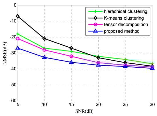 The method proposed in this paper is compared with the methods of hierarchical clustering, K-means clustering, and tensor decomposition. Figure 5 shows the averaged normalized mean square error obtained by 100 Monte Carlo independent tests when the signal-to-noise ratio (SNR) is in the range of for different methods. The simulation results show that with the increase of SNR, the estimation accuracy of each method will be improved. In this paper, due to the improvement of the iterative clustering process, the error value proposed by the method in question is the smallest, so a precise mixing matrix estimation can be achieved.