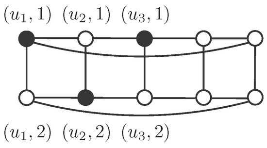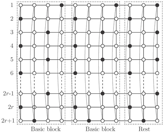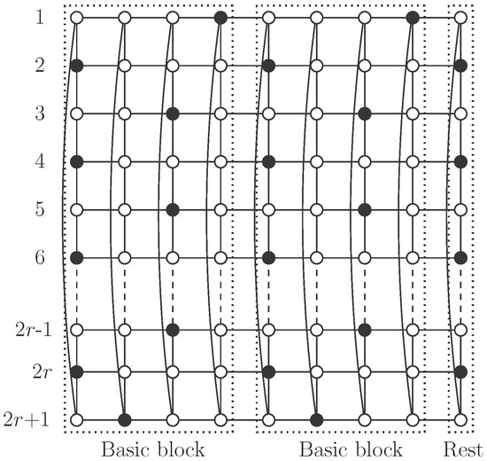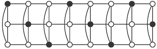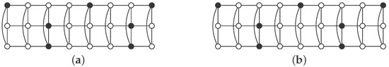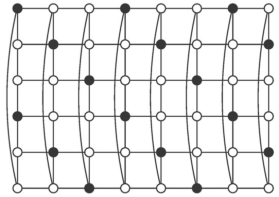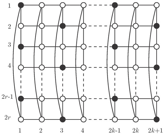 Using , consider the pattern described in Figure 5, where set S consists of black vertices. There are no vertices of S in the even columns. Regarding odd columns, we begin with vertices in odd positions in the first one and then we alternate with vertices in even positions. Clearly S is an independent -set in . Moreover, in each odd column there are r vertices of S, so