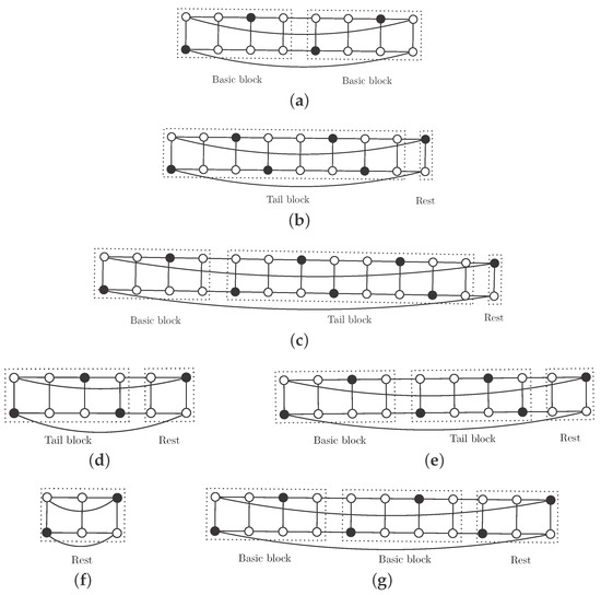 If , then and . We construct the independent -set by adding r copies of the basic block to the rest for this size, as is shown in Figure 2f if and in Figure 2g if . We obtain an independent -set with vertices.