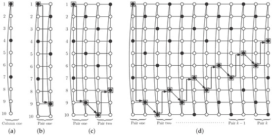 Construction of a regular pattern for an independent -set in : (a) first column; (b) a pair of columns; (c) two pairs of columns; (d) k pairs of columns.