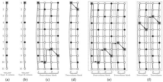 We place a two-column block after another block (with four or two columns), rotating the second block in such a way that its mark vertex is in positions shown in Figure 10e,f.